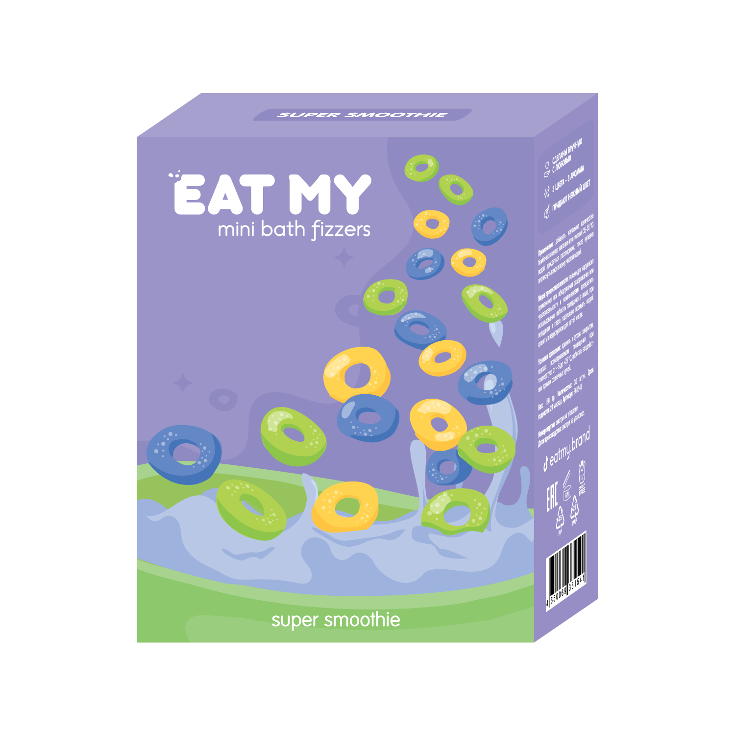 EAT MY mini bath fizzers are made to fill you with energy and great mood any time: just pour them into the water when taking bath. The quantity of fizzers depends on you - the more the funnier! Each colour in set has its own flavour: try them mixed or separated.